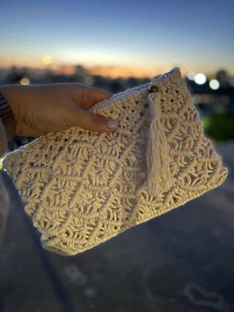 Sobre confeccionado en macramé con borla decorativa en el deslizador.
